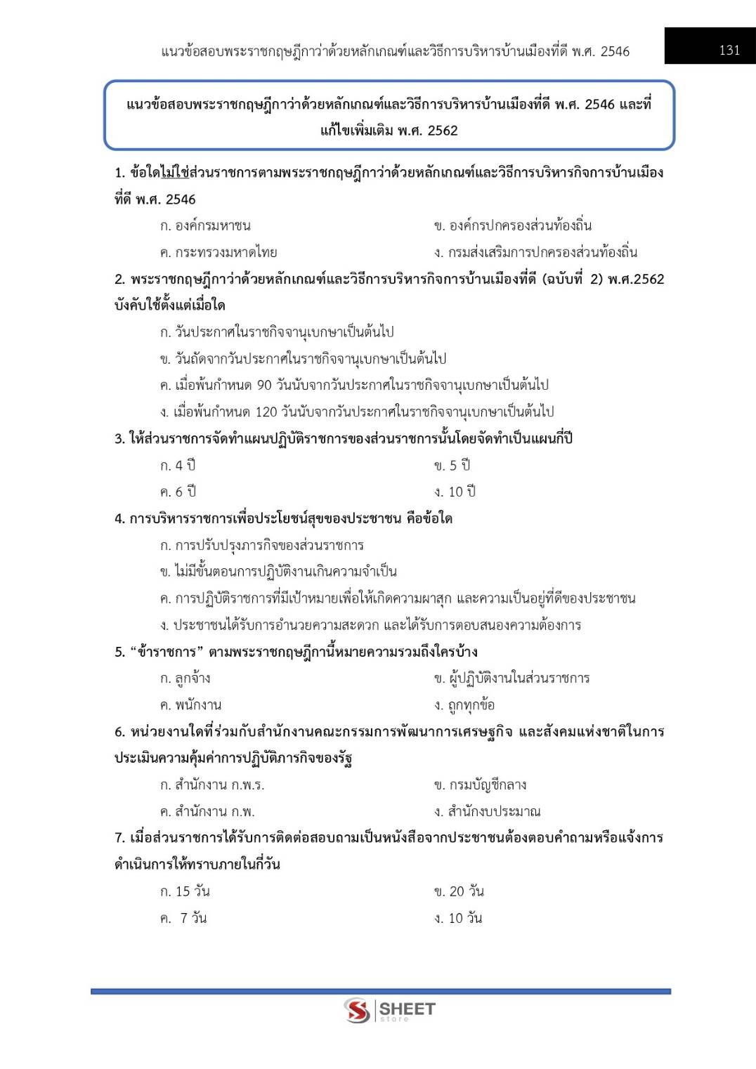 – แนวข้อสอบสรุปสาระสำคัญพระราชกฤษฎีกาว่าด้วยหลักเกณฑ์และวิธีการบริหารกิจการบ้านเมืองที่ดี พ.ศ.2546 และที่แก้ไขเพิ่มเติมถึง (ฉบับที่ 2) พ.ศ.2562