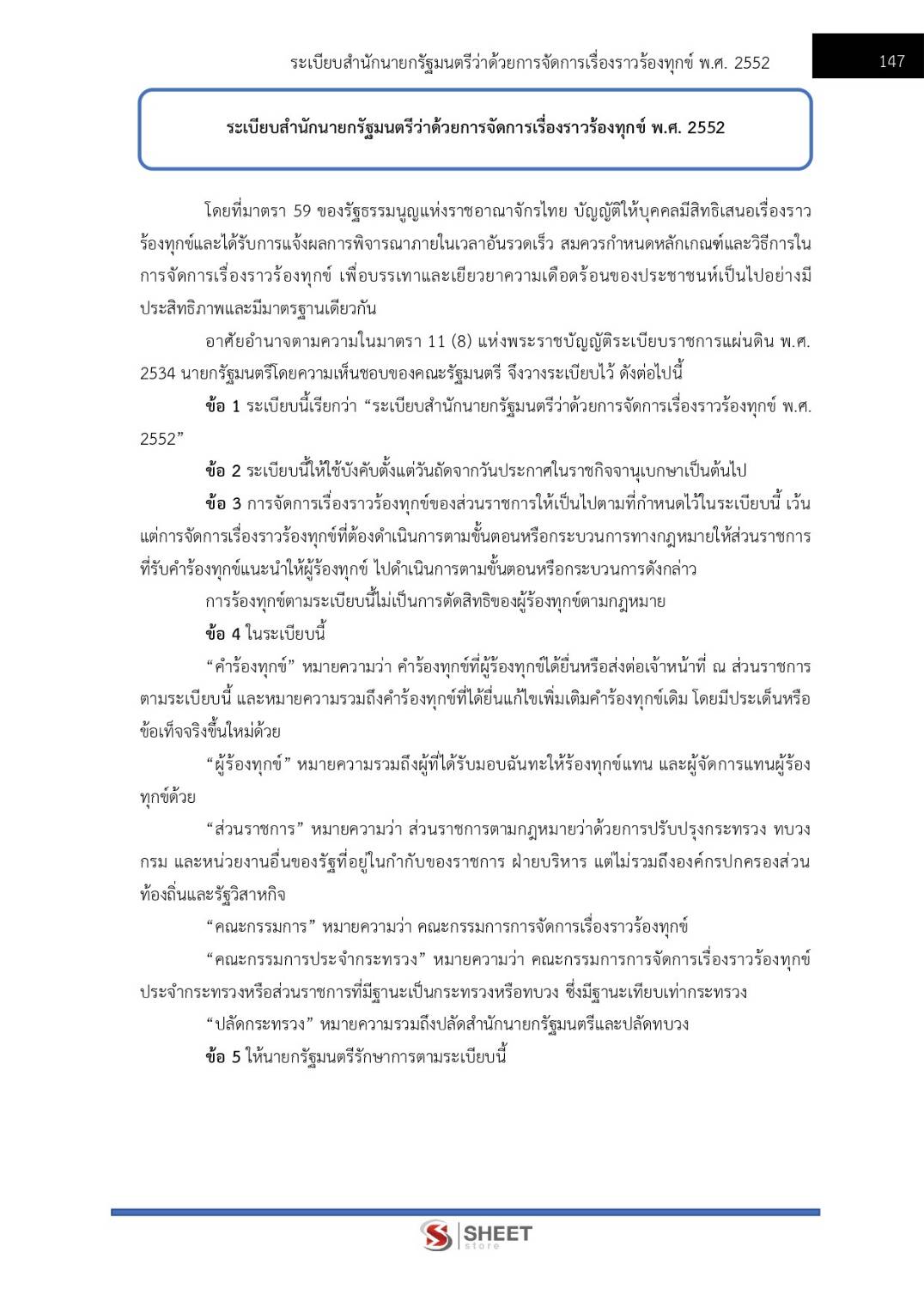 – ระเบียบสำนักนายกรัฐมนตรีว่าด้วยการจัดการเรื่องราวร้องทุกข์ พ.ศ.2552