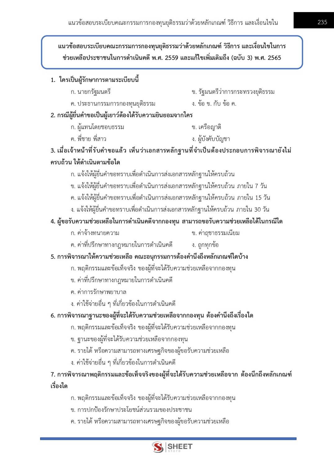 – แนวข้อสอบระเบียบคณะกรรมการกองทุนยุติธรรมว่าด้วยหลักเกณฑ์ วิธีการ และเงื่อนไขในการช่วยเหลือประชาชนในการดำเนินคดี พ.ศ.2559 และแก้ไขเพิ่มเติมถึง (ฉบับ 3) พ.ศ.2565