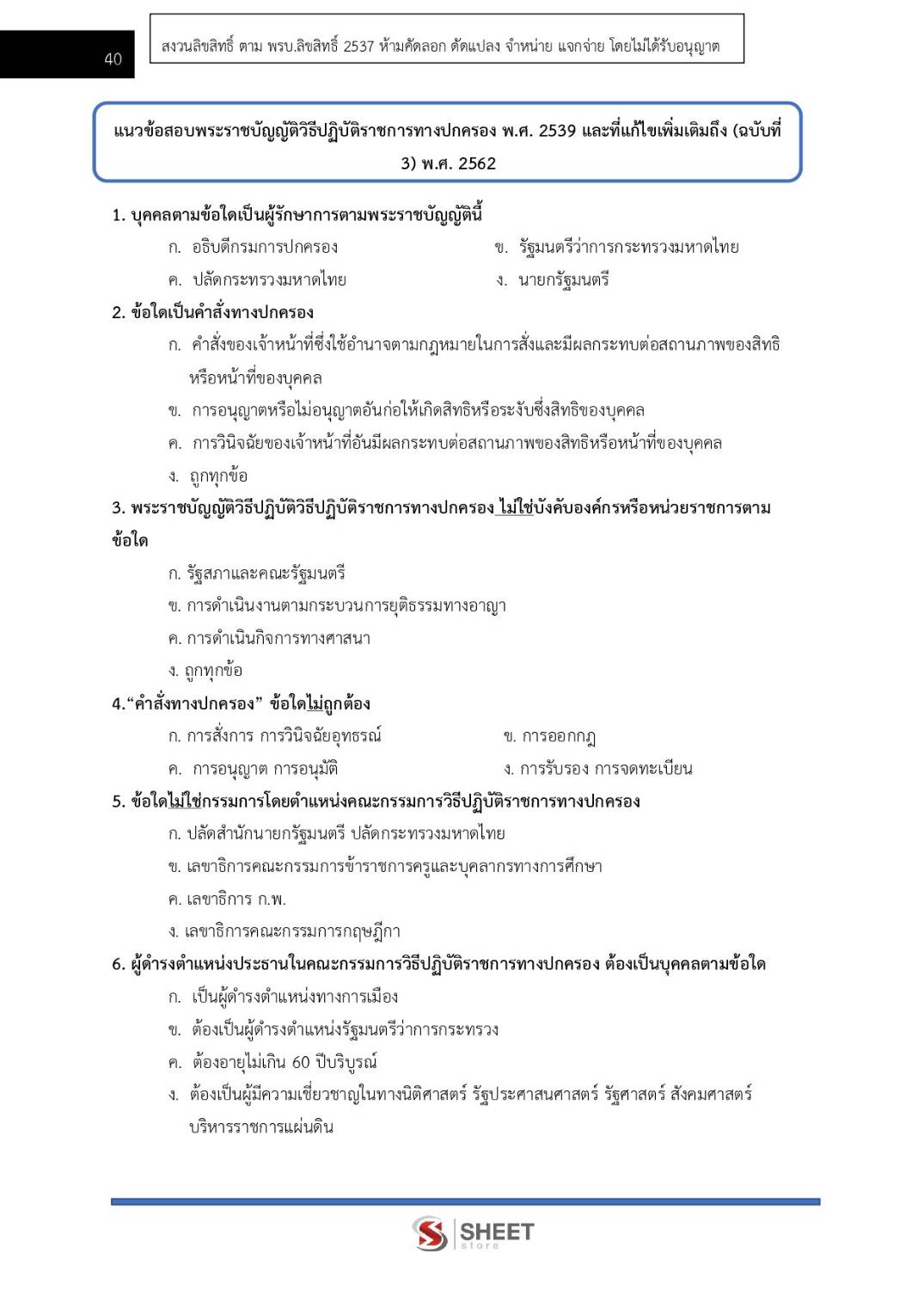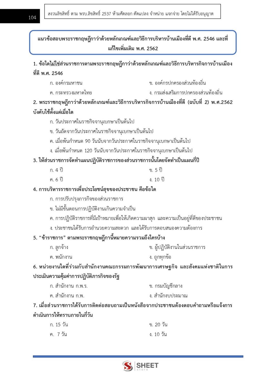 – แนวข้อสอบสรุปสาระสำคัญพระราชกฤษฎีกาว่าด้วยหลักเกณฑ์และวิธีการบริหารกิจการบ้านเมืองที่ดี พ.ศ. 2546 และที่แก้ไขเพิ่มเติมถึง (ฉบับที่ 2) พ.ศ. 2562