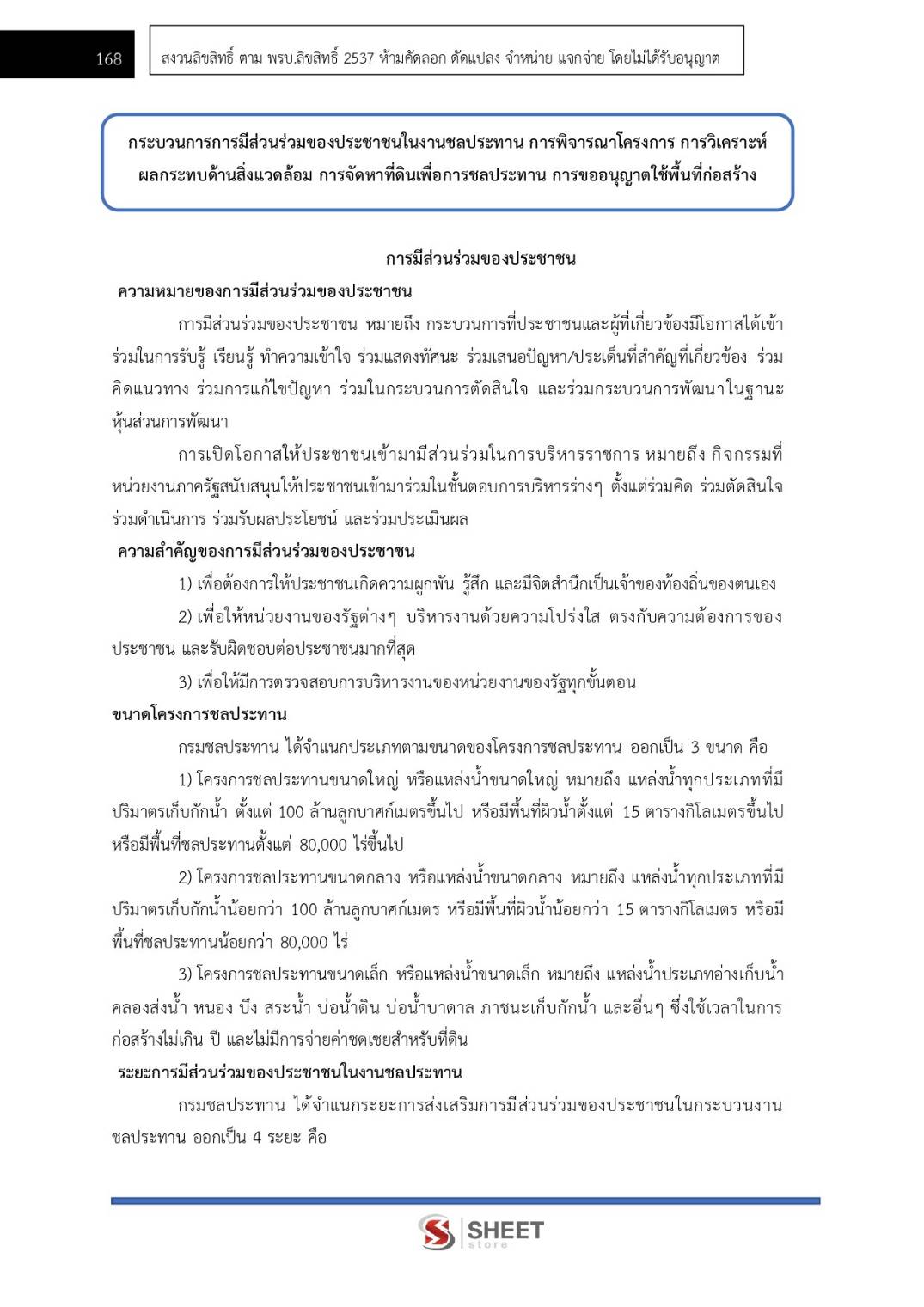 – กระบวนการการมีส่วนร่วมของประชาชนในงานชลประทาน การพิจารณาโครงการ การวิเคราะห์ผลกระทบด้านสิ่งแวดล้อม การจัดหาที่ดินเพื่อการชลประทาน การขออนุญาตใช้พื้นที่ก่อสร้าง