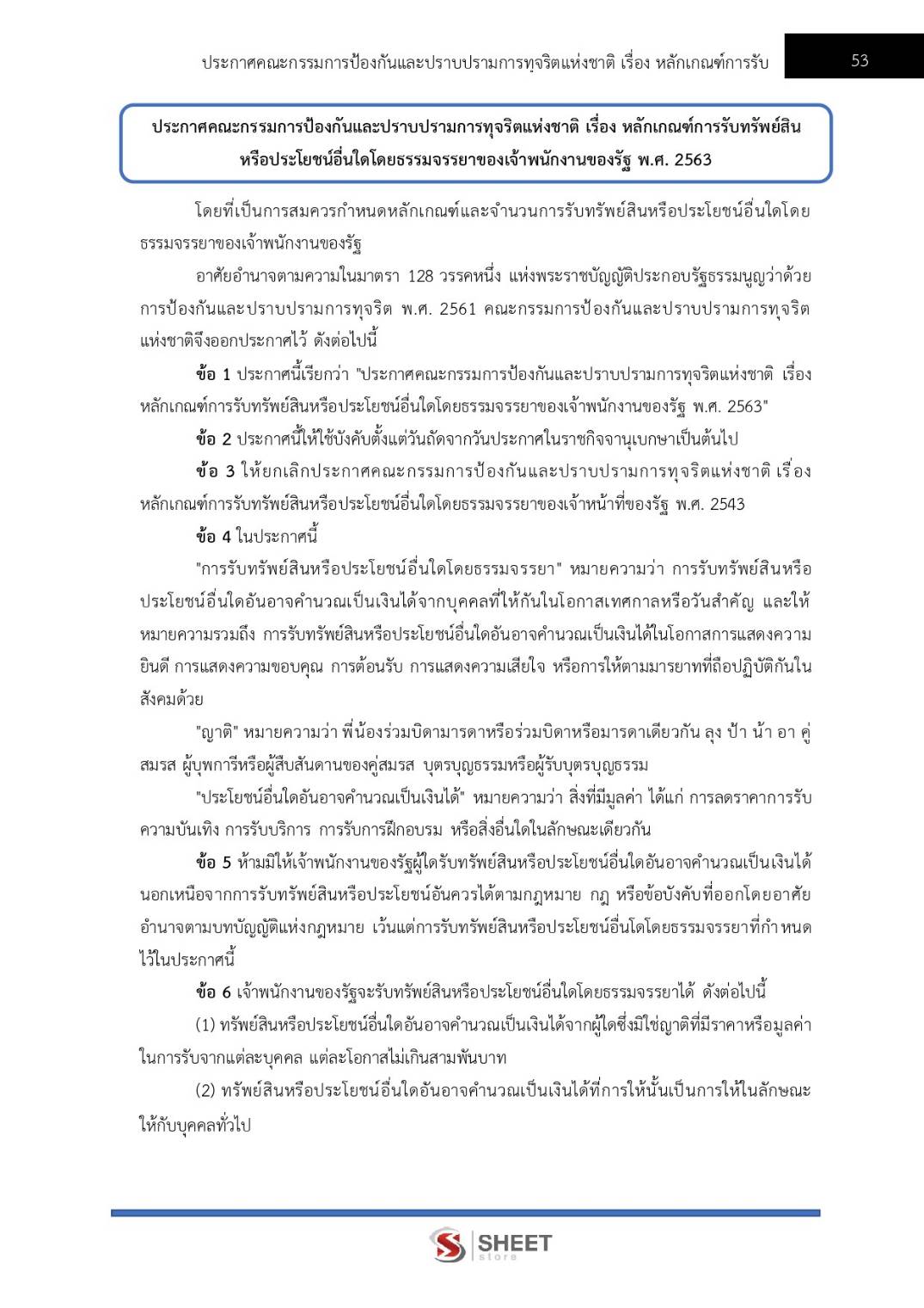 – ประกาศคณะกรรมการป้องกันและปราบปรามการทุจริตแห่งชาติ เรื่อง หลักเกณฑ์การรับทรัพย์สินหรือประโยชน์อื่นใดโดยธรรมจรรยาของเจ้าพนักงานของรัฐ พ.ศ. 2563