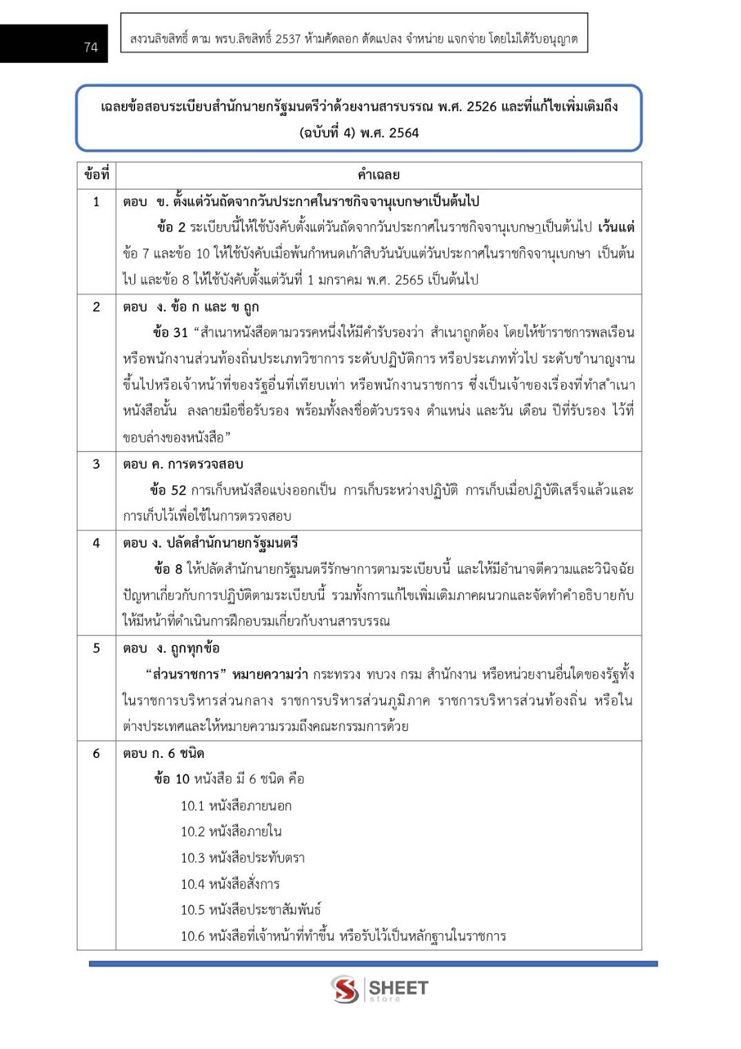 – แนวข้อสอบสรุปสาระสำคัญระเบียบสำนักนายกรัฐมนตรีว่าด้วยงานสารบรรณ พ.ศ. 2526 และที่แก้ไขเพิ่มเติมถึง (ฉบับที่ 4) พ.ศ. 2564