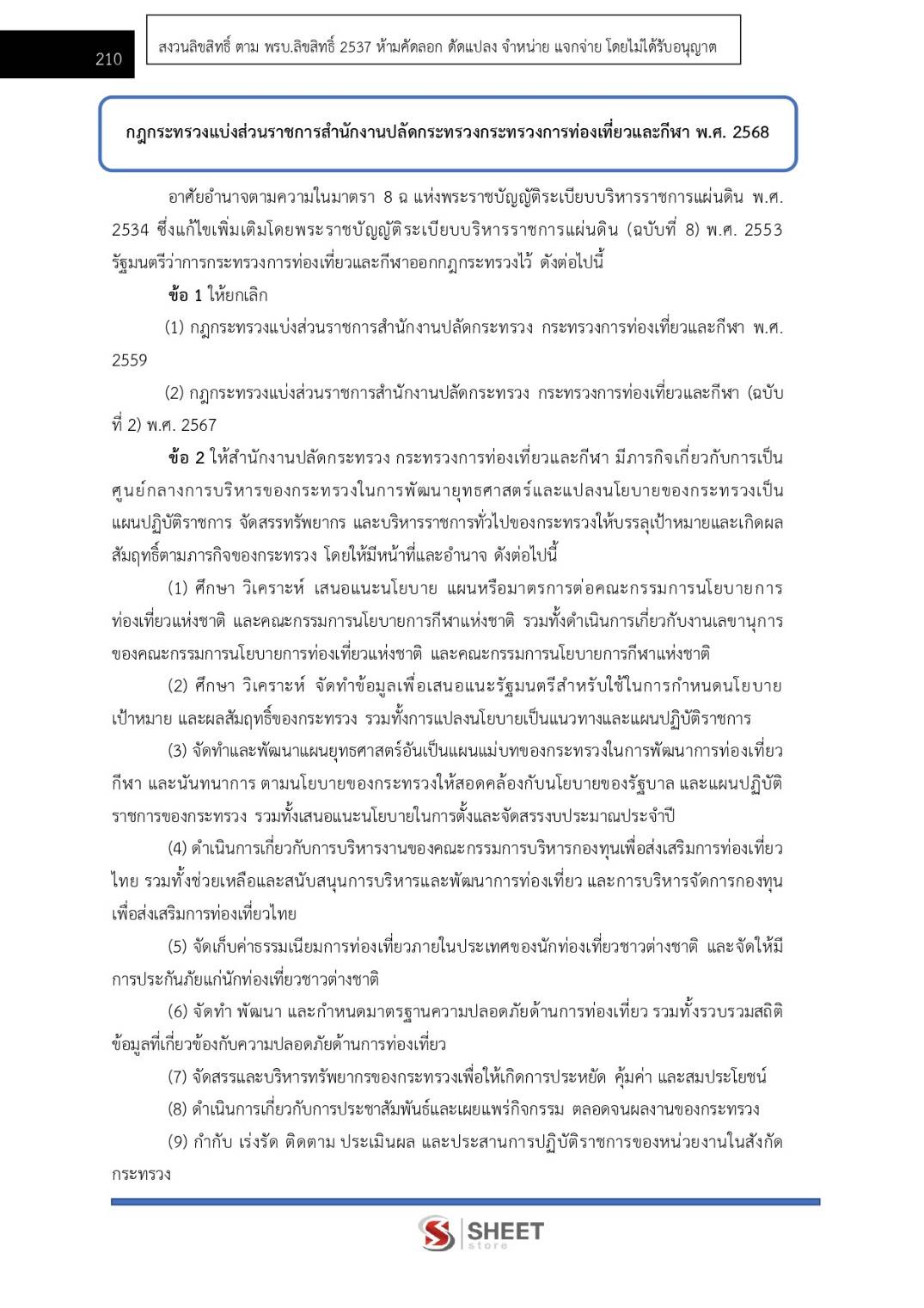 – กฎกระทรวงแบ่งส่วนราชการสำนักงานปลัดกระทรวงการท่องเที่ยวและกีฬา พ.ศ. 2568